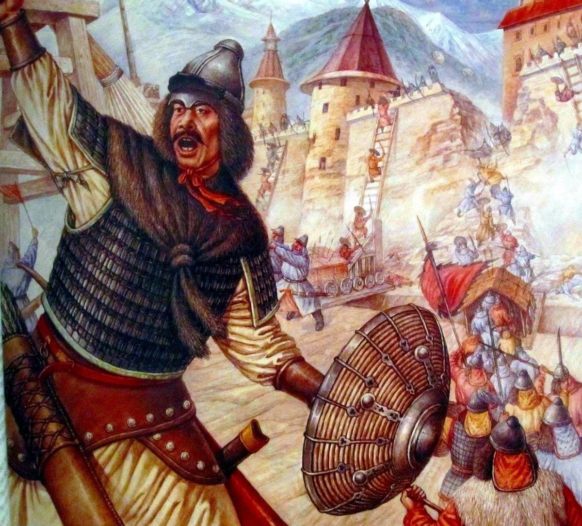 I trotted to the edge of the wall and peered down. At the bottom of the ladder was a commotion of Tatars with long pikes, pressing a nervous soldier to climb. They laughed in their rhythmic way and did not seem much filled with hellfire. The reluctant soldier wept and wailed. He gripped the ladder’s base like a ship's mast in the high seas and could not be extricated from it no matter the kicks or prods he received.
